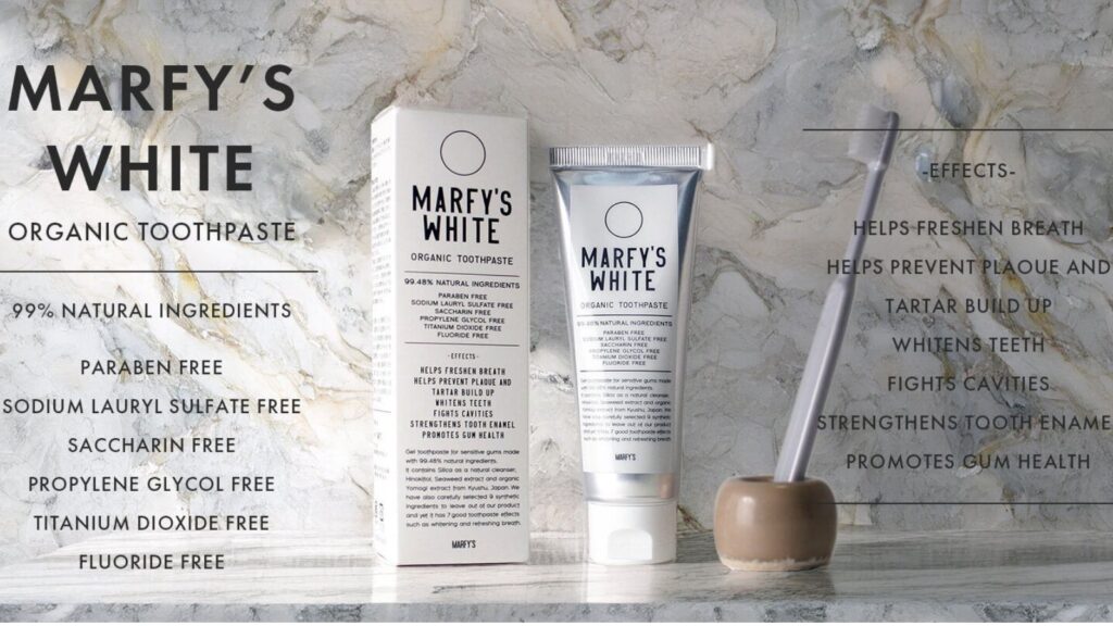 歯科医師の “毎日口にする歯磨き粉から健康を追求する” という想いより開発されたオーガニック歯磨き粉、マーフィーズホワイト(MARFY’S WHITE)です。